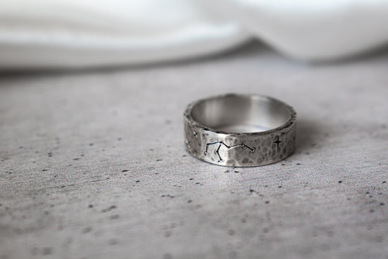 Grabado: La constelación de Acuario está hecha a mano con buril, lo que asegura un acabado detallado y único en cada anillo.